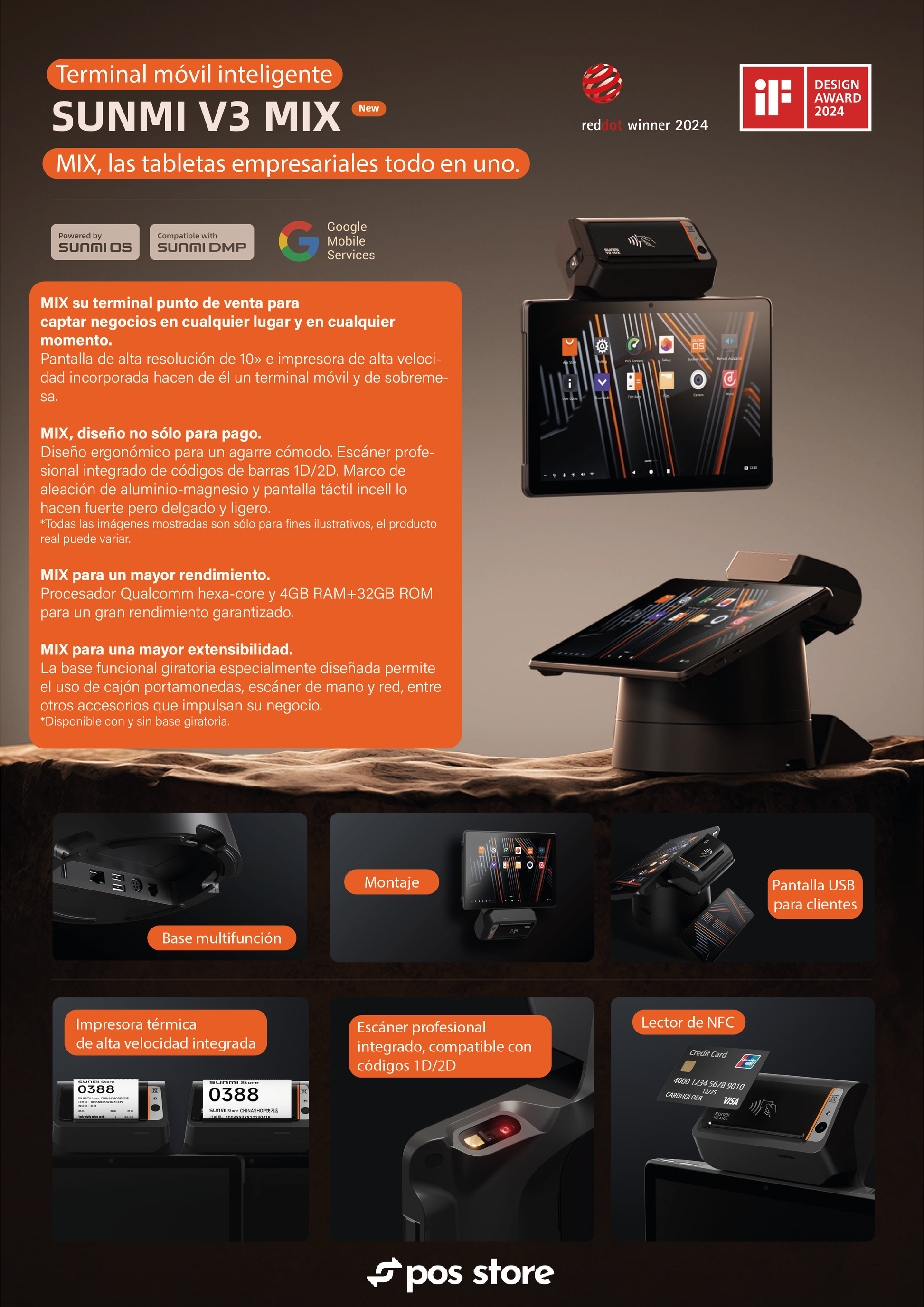 The Sunmi V3 Mix is a desktop point of sale (POS) terminal designed to offer a complete and efficient solution to small and medium-sized businesses .