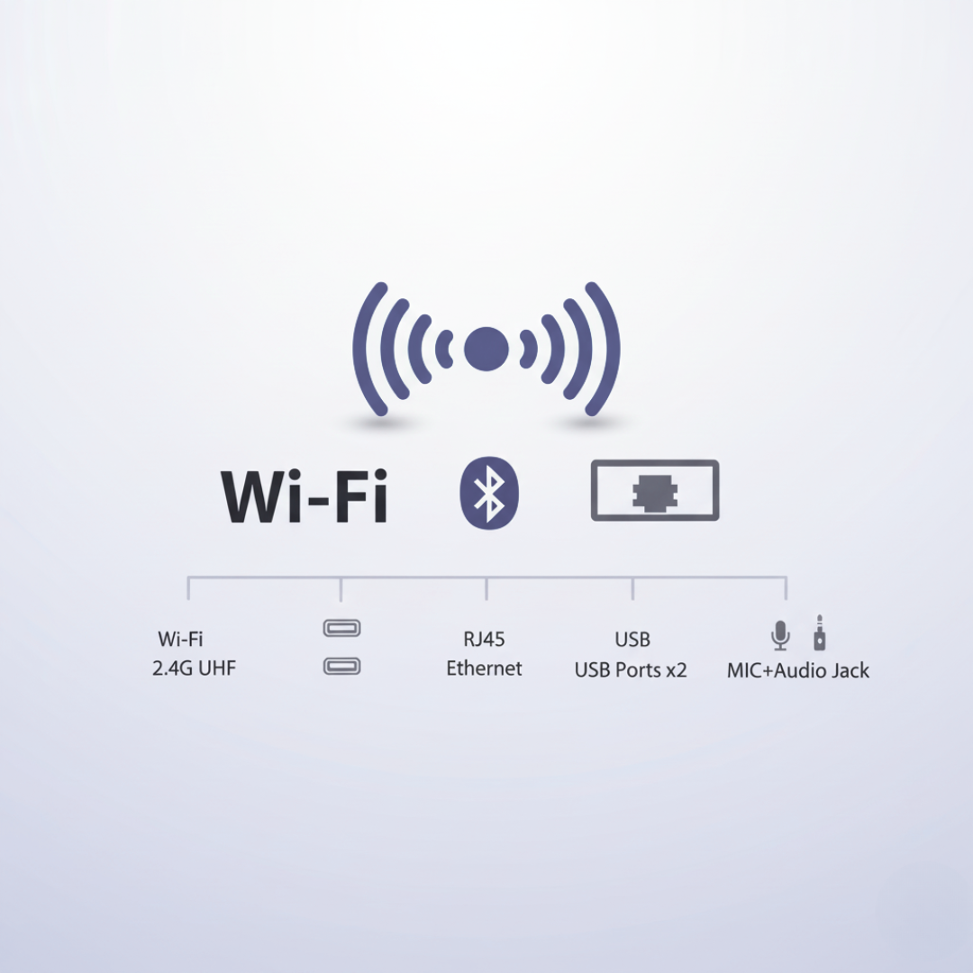- Conectividad Completa para Entornos Profesionales: Incluye Wi-Fi 2.4G de alta velocidad, Bluetooth 4.0, puerto RJ45 (Ethernet) para conexión por cable estable, y puertos USB (x2) para periféricos como teclados o lectores de códigos.